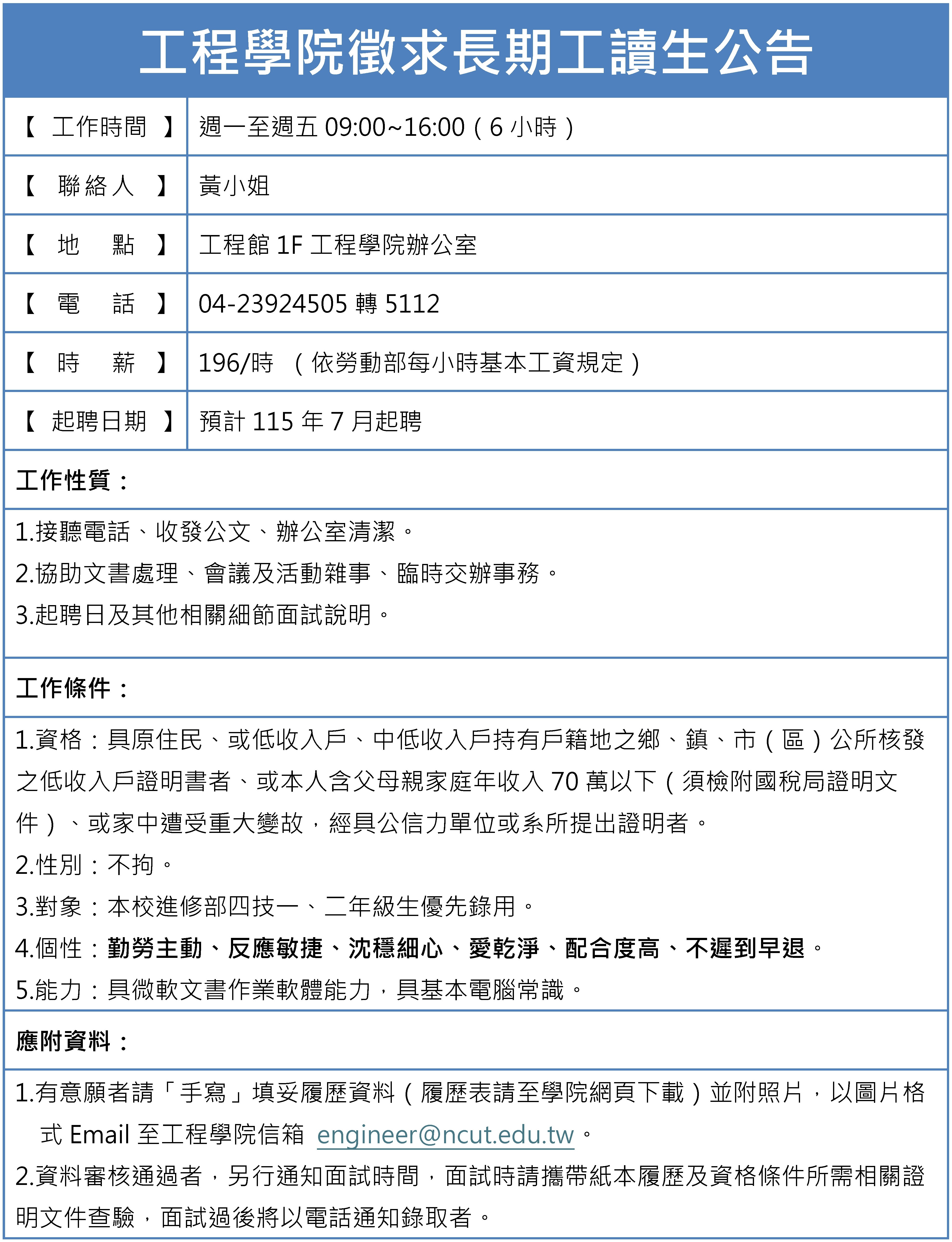 【工程學院】誠徵全職工讀生1名(起聘日115/07/01)