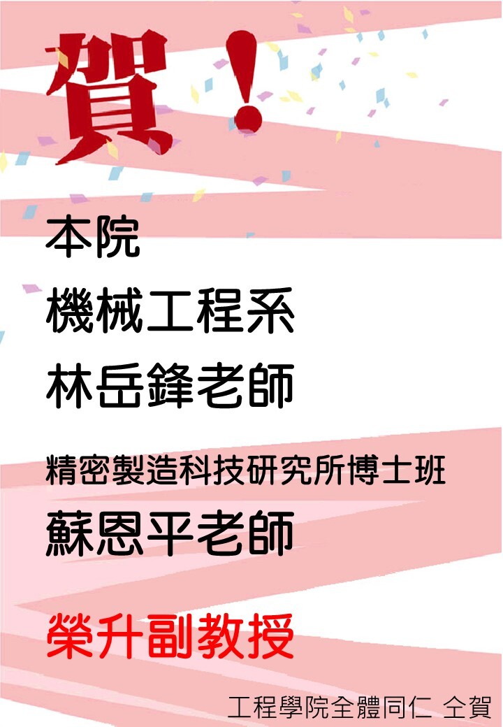 賀本院機械系林岳鋒老師、精密所蘇恩平老師榮升副教授